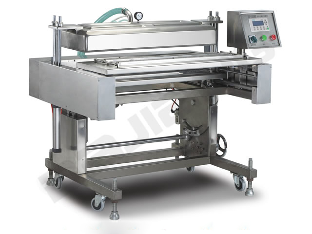 Automatic continuous vacuum packaging machine achieves the goal of continuous operation by using the bottom plates of the two vacuum chambers with alternative fore-and-after movements. Depending on the size of the contents and different requirements, one or two gland strips can be set within one chamber in order to improve working efficiency.The bottom plates of the two vacuum chambers of the series can move in two modes: pneumatic driving and mechanical driving.